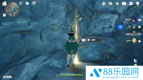 3、来到此处传送点,镜头向右,看到瀑布后往瀑布方向走,能够看到有一个风元素方碑,解锁后能够借助风场向上飞,飞到顶后能够看到一个柱子横置着,三号化石照片就在上面(此外此处还有一个华丽的宝箱)。