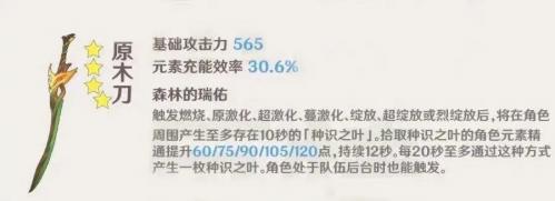触发燃烧、原激化、超激化、蔓激化、绽放、超绽放或烈绽放后,将在角色周围产生至多存在10秒的「苏生之叶」。拾取苏生之叶的角色攻击力提升16/20/24/28/32%,持续12秒。每20秒至多通过这种方式产生一枚苏生之叶。