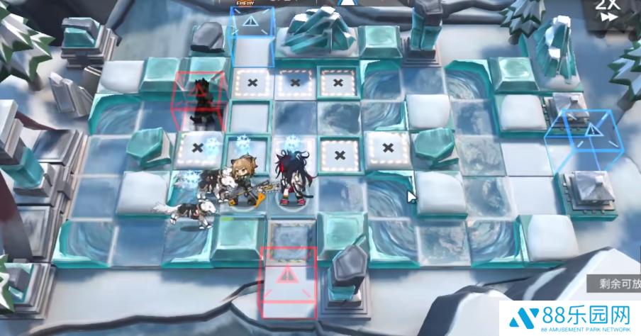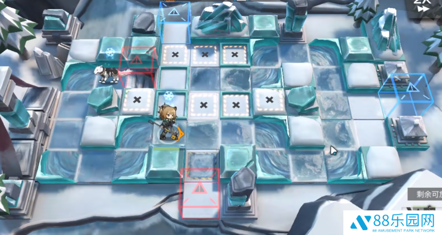 在这关中我们会遭遇下雪天气,站在冰冻格子上的干员再被下雪刮一下就会冻住了,所以常规打法下比较容易漏怪,尤其是弑君者。因此我们直接选择堵红门,这样弑君者闪现后会立刻被阿消推回原位,无限重复,轴是自动对好的。