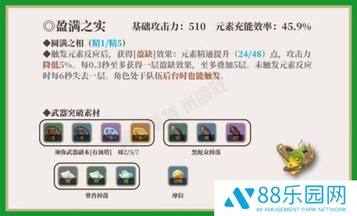 4星武器中,基础攻击力仅次于暗巷闪光(610),突破增加元素充能效率。掉落“种识之叶”全队都可以拾取,谁拾取谁加精通,最多拾取1枚。