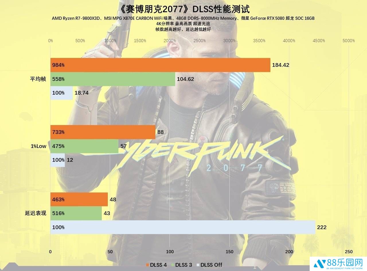 在实际游戏测试中,微星GeForce RTX 5080超龙SOC显卡同样表现出色。在《赛博朋克2077》中,开启DLSS 4后,游戏帧数从18.74 FPS提升至184.42 FPS,性能提升8.8倍。在《霍格沃兹之遗》中,开启DLSS 4后,游戏帧数从78 FPS提升至358 FPS,性能提升约4.5倍。