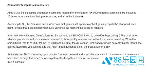 在与华硕中国高层的交流中,苏姿丰自豪地宣布,RX 9000系列已成为AMD有史以来最畅销的GPU产品。然而,这种“成功”的背后,却隐藏着“黄牛党”大量抢购、清空库存的阴影。尽管AMD为RX 9070设定的官方建议零售价为549美元,XT版本为599美元,但在实际市场中,这些显卡的价格却远远超出了这一范围。对于玩家们来说,想要找到一张未被黄牛高价转手的显卡,简直难如登天。