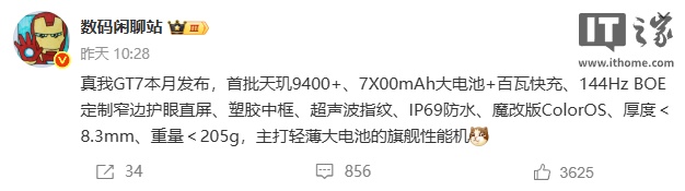 据博主@数码闲聊站 爆料,这款新机首批搭载天玑 9400+ 处理器、内置“7X00mAh 电池”(容量超 7000mAh)、配备 144Hz BOE 定制窄边护眼直屏。