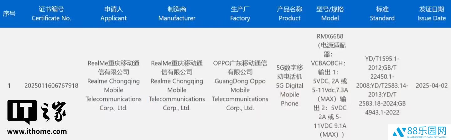 在此之前,一款型号为 RMX6688 的 realme 新机于 4 月 2 日通过了国内 3C 认证,支持 100W 快充,预计为即将发布的真我 GT7 手机。