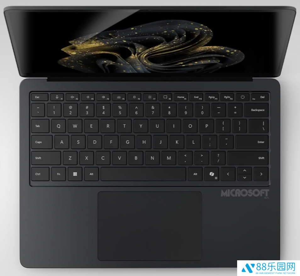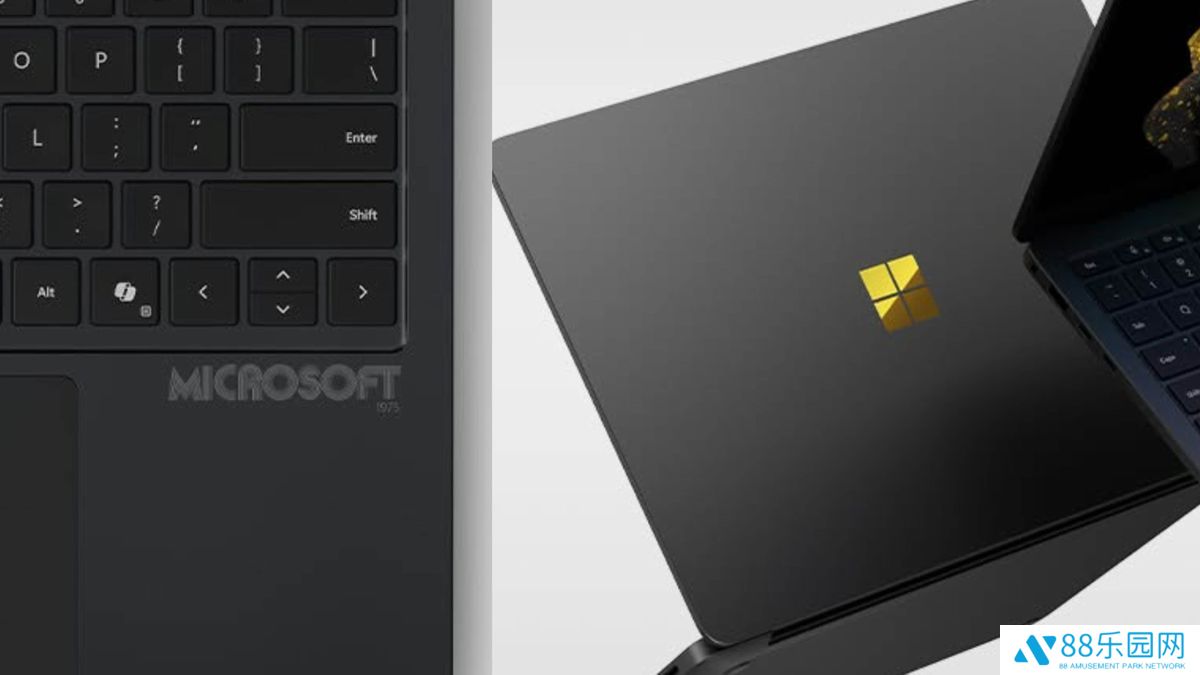 本站注意到,这款纪念版 Surface Laptop 延续了微软Surface家族式哑光黑外观,背部印有金色的微软现行Logo,键盘旁刻有 1975 年版的微软 Logo,同时笔记本配备专属的黑金风格壁纸。