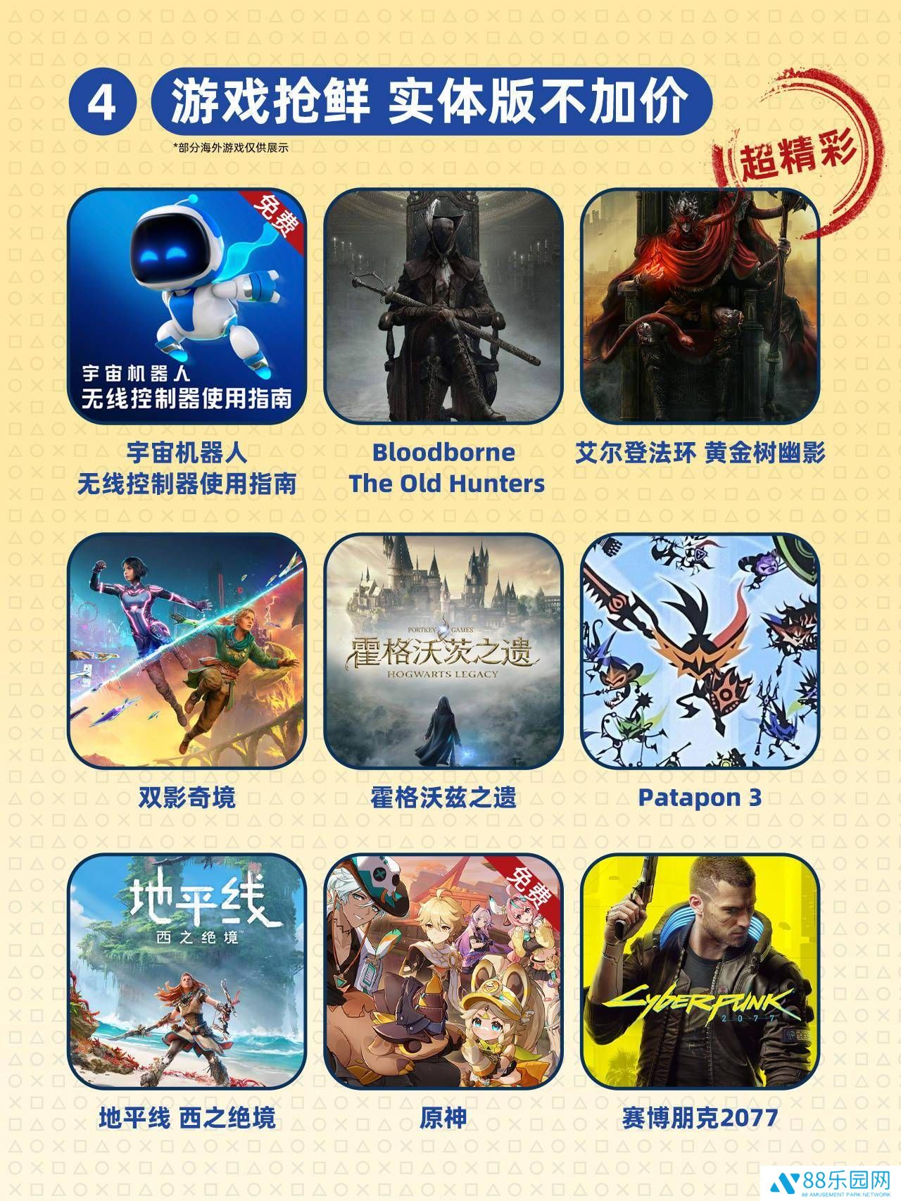 在游戏支持方面,PS5也不负众望。玩家可以在PS5上体验到《宇宙机器人》、《艾尔登法环》及其DLC《黄金树幽影》、《双影奇境》、《霍格沃茨之遗》、《赛博朋克2077》以及《原神》等众多热门游戏。而且,这些游戏的实体版并不会加价销售,为玩家提供了更多的选择。