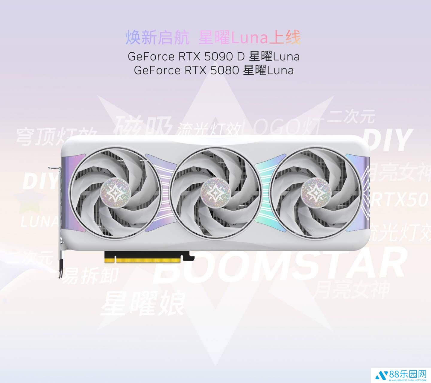 从展出的图片中可以看出,星曜Luna系列显卡的外观设计兼具未来感与艺术美感,流线型的机身搭配独特的灯光效果,无疑将为用户带来沉浸式的游戏体验。而此次即将发布的RTX 50系列星曜显卡,预计将在保持这一系列设计精髓的基础上,进一步融入创新元素,满足玩家对于高性能与高颜值的双重追求。