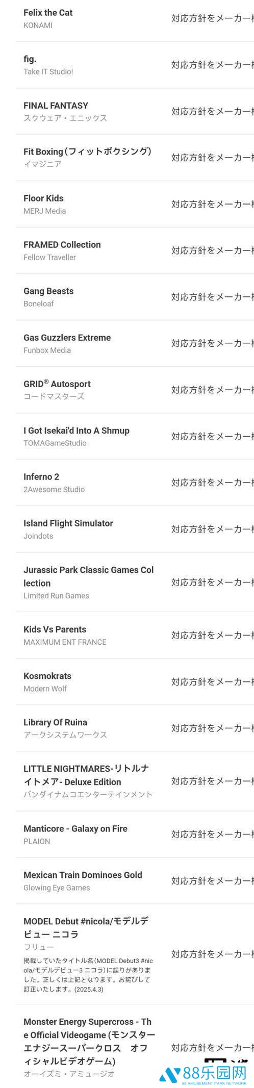同时,任天堂还公布了运行验证中确认存在问题的第三方游戏名单,共计141款。这些游戏可能因各种原因无法在新主机上正常运行,玩家在尝试之前应做好充分的了解和准备。