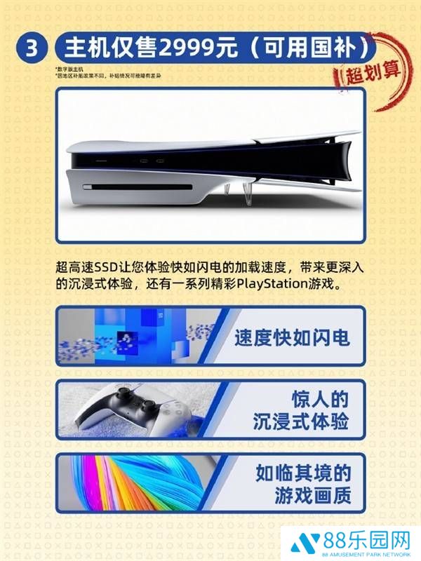 在官方晒出的宣传图片中,PS5主机以2999元的亲民价格亮相,并标注了“可用国补,实体版游戏不加价”的优惠信息。这一价格相较于市场上其他高端游戏主机,无疑具有极大的吸引力。PS5还内置了1TB的存储空间,并支持加装多种规格的M.2 SSD,为玩家提供了充足的数据存储和扩展空间。