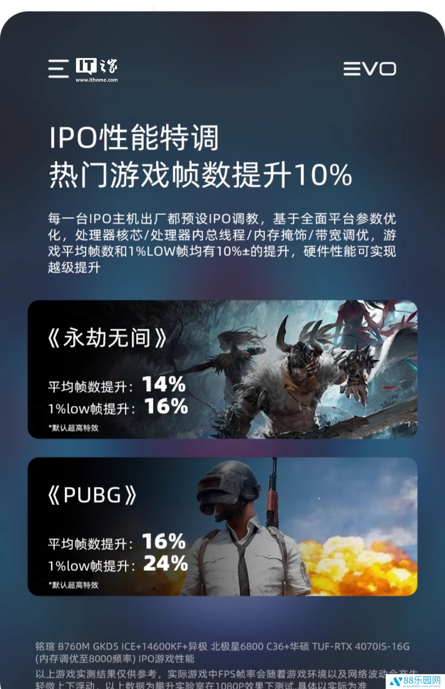 UNIKO"s Hardware 发现攀升等品牌整机厂商已经推出搭载 IPO 优化处理器的新配置,例如 i5 14600KF、i7 14700KF、Ultra 7 265KF 配置应用了英特尔 IPO 特调方案游戏帧率提升 10%。