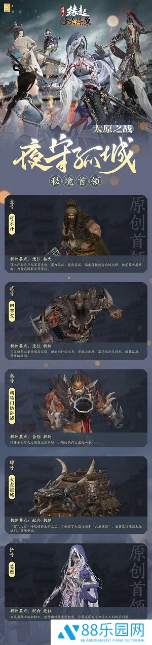 太原之战·夜守孤城 至德二载正月,史思明联兵十万围困太原,一月下旬,靺鞨、龟兹奇兵突袭,攻势猛烈,太原正有累卵之危!情况紧急,侠士可组队前往迎战可木汗、田布戈、莫遮等强敌,守卫朝曦门、截击攻城器械,于烈火焦土中力挽山河!