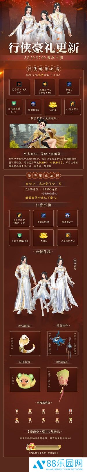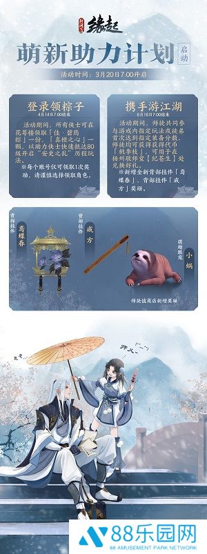 侠义传薪火 桃李共携游 为助力各位萌新侠士快速开启历程,即日起至4月14日7:00,全服20级以上或已加入门派的侠士均可于花萼楼领取「佳·碧筠粽」一份与「真橙之心」一颗,使用「佳·碧筠粽」可使侠士立即提升至80级,寄情江湖!另有「携游江湖」活动同步开启,师徒共战或徒弟装分突破指定分数时,二人皆可获得「桃李枝」代币。在扬州敬师堂「纪苍生」处使用代币即可兑换全新背部挂件「鸢蝶春」、背部挂件「戒方」,还有绑定版「五行石(五级)」、「匡义令·日」、「战魂佩·日」相赠。愿君恣意凌云,侠路坦荡!