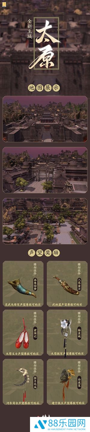 战意淬锋 共卫太原 铁骑围孤城,共守山河志!《剑网3缘起》全新主城「太原」烽烟之下正待侠士力破危局!即日起,侠士可驰援太原,参与场景公共事件累积"历史积分",投身历史洪流!随着剧情的推进,声望上限与任务同步革新!不同阶段都有不同的势力进驻,擦出不一样的火花!侠士还可前往太原西城造访「陈真真」,接取周常任务“珍世稀材”,完成后即可获得40份装备升品材料「沉香玉·夜守」!若太原剧情已达第四阶段,任务还会额外赠送3份神兵升阶秘宝「金玄玉」,淬炼神兵如虎添翼!