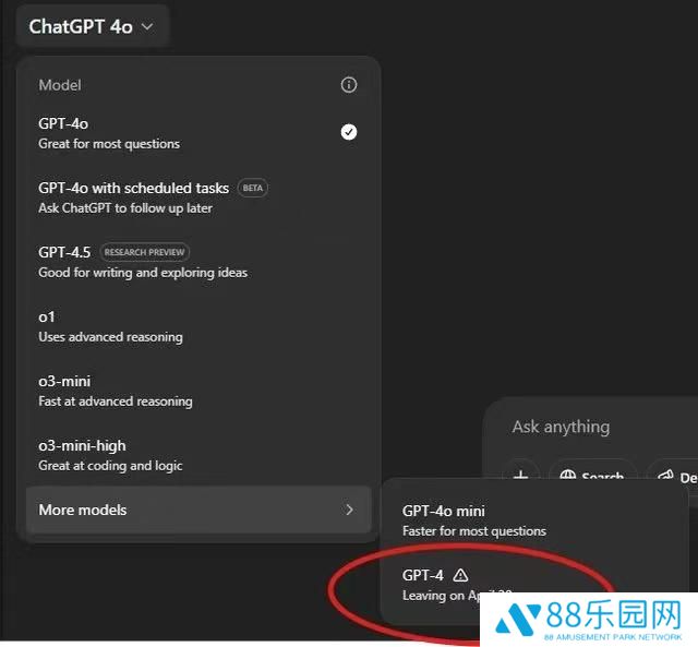 本站查询发现,OpenAI 于 2023 年 3 月 14 日正式发布 GPT-4,目前官网页面中 GPT-4 已经新增了“即将于 4 月 30 日下线”的提示信息。