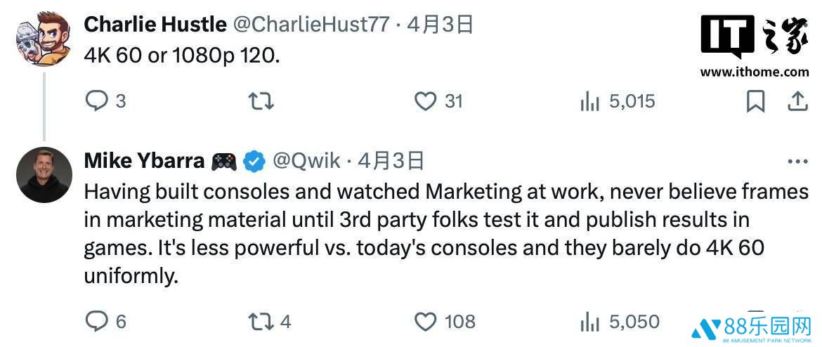 不仅如此,Mike Ybarra还分享了自己对Switch 2性能的一些看法。他提到,尽管有玩家声称Switch 2能够支持4K 60帧或1080P 120帧的画面输出,但基于他过去在游戏机开发和营销领域的经验,他提醒大家不要过早相信厂商的宣传。他认为,在没有第三方测试结果之前,应保持谨慎态度。同时,Mike Ybarra还指出,与当前世代的游戏机相比,Switch 2的性能可能并不出众,难以在所有游戏中实现4K 60帧的流畅体验。
