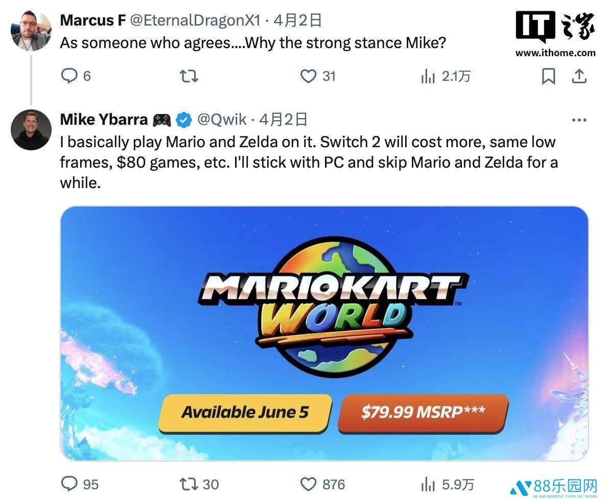 Mike Ybarra首先指出,他个人对Switch 2的定价感到难以接受。他透露,自己一直以来都是利用初代Switch来享受《马力欧》和《塞尔达传说》这两大经典系列,但由于Switch 2的高昂价格、帧率表现不佳以及游戏售价高达80美元等因素,他做出了一个决定:继续坚守PC平台,暂时搁置这两个系列的游戏。