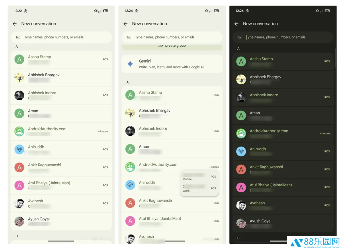 在点击相应联系人“支持RCS消息的号码”创建“新对话(New conversation)”后,用户还可以注意到收方号码变成了 Material You 粉彩配色,作为比较,如果收方的号码不支持RCS消息,那么在创建新对话时,对方的号码只会以黑色配色显示。