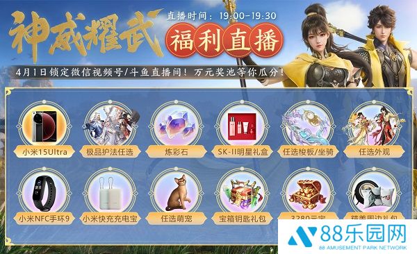 【亮点4:福利直播抽奖来袭 豪华大奖等你拿】 “神威耀武”资料片嘉年华开启,各位少侠不仅可以在游戏内参与新版本各项活动,也可以在【神威直播盛典】抽取多重豪华大奖!参与游戏内日常活动获得兑换材料,集齐后兑换好礼有机会获得直播抽奖券、护法招募券、现金红包兑换等。拥有抽奖券的少侠可参与4月1日晚官方直播间的活动,小米15Ultra夜神手机、SK-II神仙水礼盒、极品护法任选、炼彩外观材料等绝品大礼等你抽取!