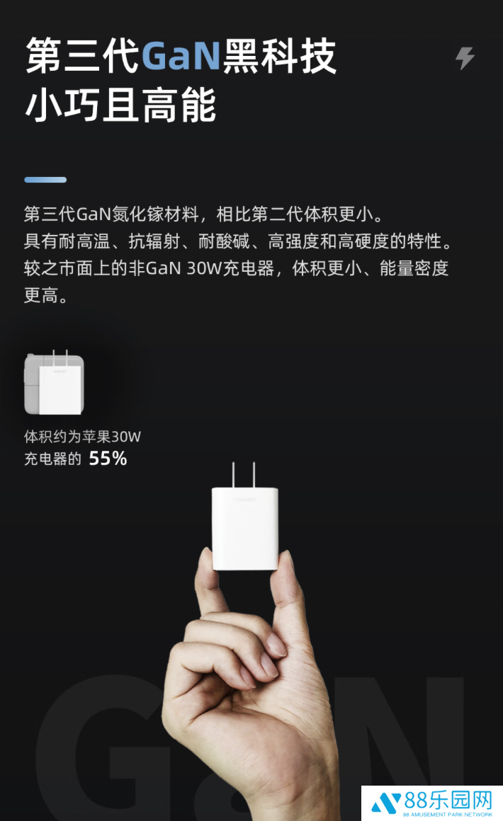 据介绍,这款充电头重量为39克,采用第三代氮化镓技术,支持 PD 充电协议,可为苹果iPhone/iPad快充,拥有18个月质量保障。