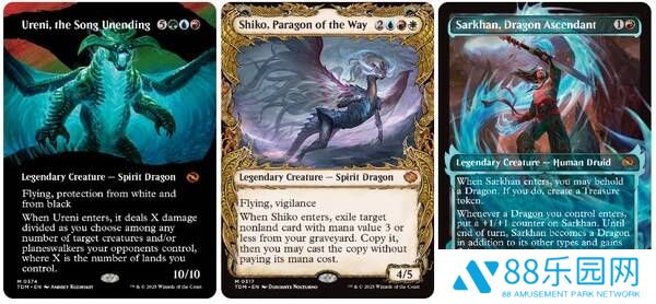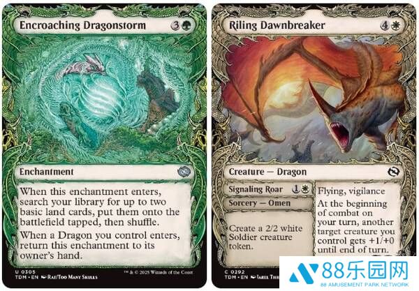 本次新系列还带来了六张新的无边框Reversible卡牌,将带翅膀生物的可怕与可爱版本完美结合。同时,找地地也以特别来宾的方式回归,全新的TexturedDragonscale处理为这片时空的传奇景致增添了沉浸式的视觉与触觉享受。