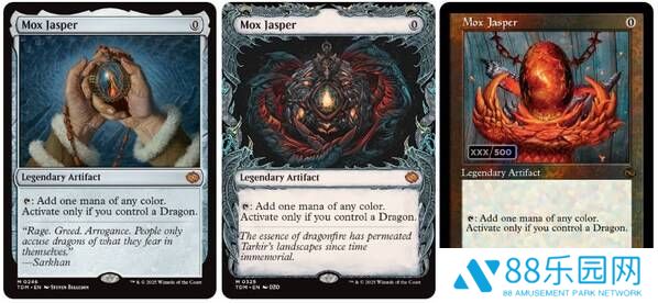 本次新系列的焦点卡牌MoxJasper,致敬了最初的玛珂牌,限量500张,卡牌本身为英文,但可能出现在任何语言的聚珍补充包中。MoxJasper的独特版本由Dan Frazier精心绘制,包括编号版、虹彩闪以及复古边框版,极具收藏价值。