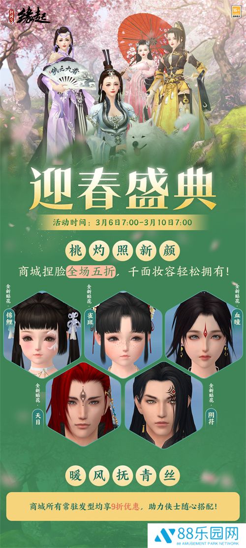 春意渐浓,焕新正当时!3月6日7:00—3月10日7:00,《剑网3缘起》开启春日限时钜惠!捏脸系统全场5折,商城常驻发型同步开启9折优惠,更有多款精致贴花即日起长期上架商城,助侠士轻松打造专属春日妆容,共赴这场美丽邂逅!