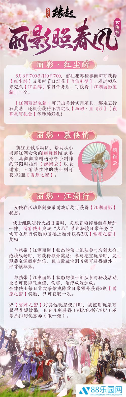 3月6日7:00-3月10日7:00活动期间,前往花萼楼界面可领取「红尘醉」与限时节日烟花「飞仙引梦」,完成「红尘醉」任务后开启「江湖丽影宝箱」即有概率获得不绑定版「马驹·里飞沙」、「夜幕星河礼盒」等惊喜掉落!完成「康舞舞」的委托必得限定挂件「鹤衔云」,已拥有该挂件的侠士则可获得「雪原之密」,对其他玩家使用「雪原之密」可为其附加养颜效果,且目标侠士有几率获得限享一张的(9折/85折/79折)不等折扣优惠券!愿各位侠士若皎月凌霜华,似飞鸿踏无踪,在这片江湖书写专属于你的璀璨篇章!