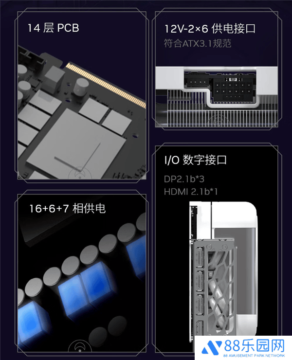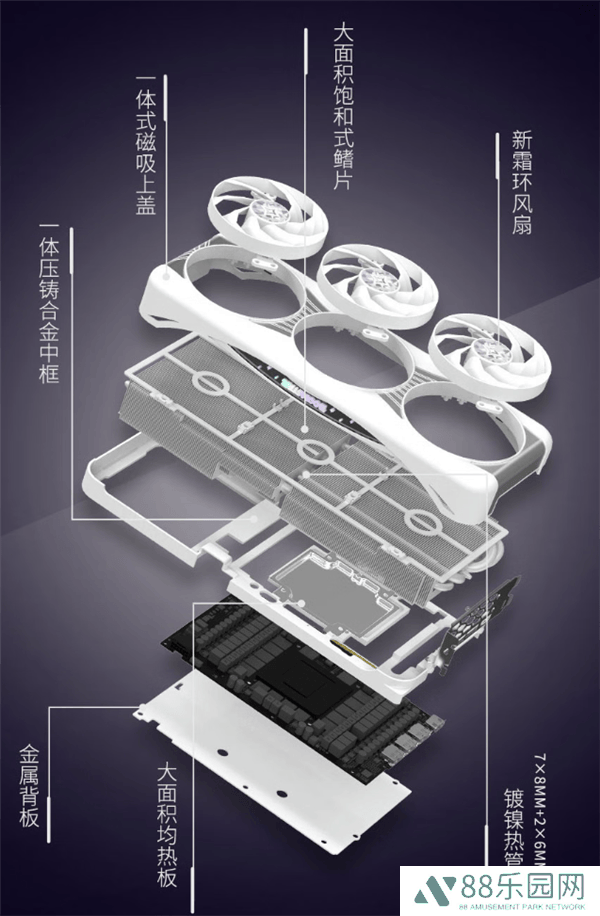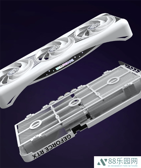 显卡的一大亮点是其一体式磁吸上盖设计。这一设计不仅让显卡看起来更加炫酷,还大大方便了玩家的清理与维护。磁吸上盖通过多个磁点固定,非常牢靠,同时可以与散热器轻松分离。风扇和灯效均采用触电式供电,玩家可以轻松拆卸和更换,实现个性化的DIY定制。