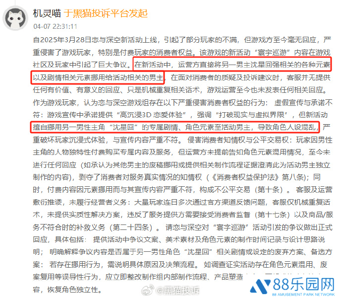 近期,手游《恋与深空》因角色素材使用问题引发了玩家的大规模不满,这一事件在黑猫投诉平台上引起了广泛关注。据玩家反馈,原本属于角色沈星回的专属伴生和印象元素,如小星球、宇宙、星空、银河等,在新推出的游戏活动中被错误地应用到了其他男性角色上。
