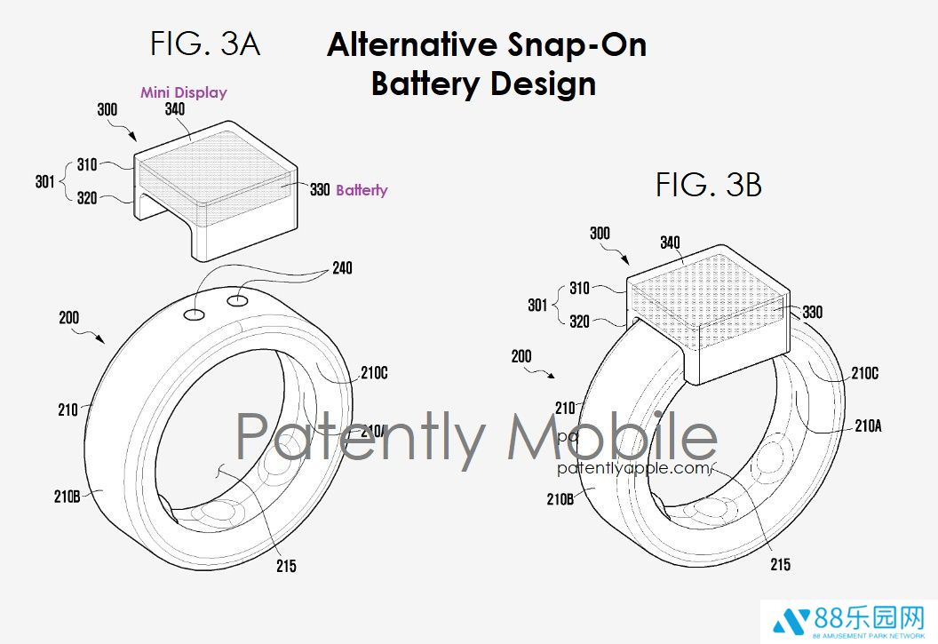 在专利图 3A 和 3B 中,三星还提出了另一种解决方案,电池可直接扣在戒指顶部,这种设计不仅便于安装,还加入了迷你显示屏(编号 340)。