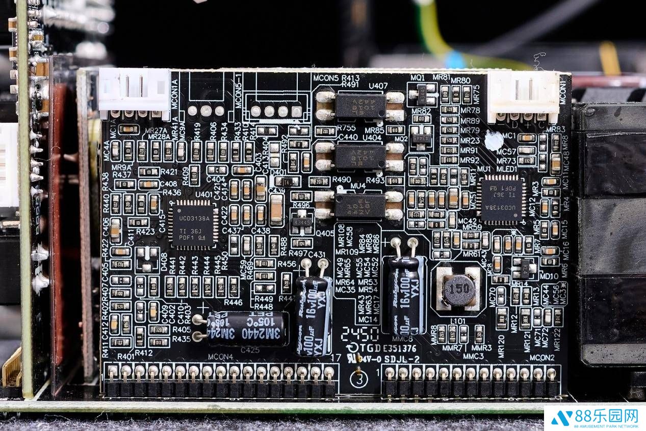 在拆解过程中,我们可以看到微星MEG Ai1600T PCIE5超神电源内部采用了CWT乔威最新的CTF平台,代表了目前最顶尖的全数字控制电源技术。MOSFET方面,该电源使用了英飞凌的服务器级碳化硅(SiC)PFC MOSFET,进一步提升了转换效率和稳定性。