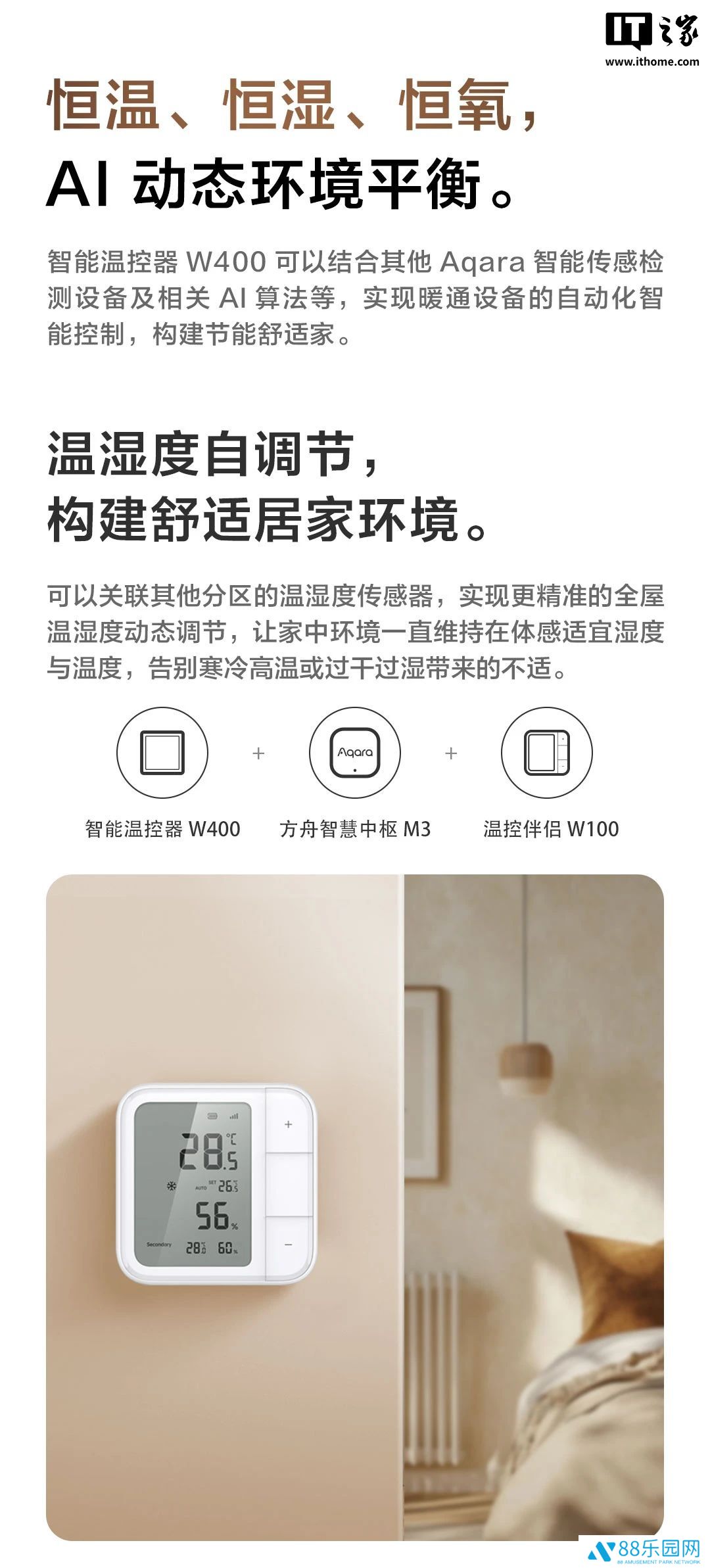 智能温控器 W400 可结合其他 Aqara 智能传感检测设备及相关 AI 算法等,实现暖通设备的自动化智能控制。新品可关联其他分区的温湿度传感器,实现更精准的全屋温湿度动态调节。