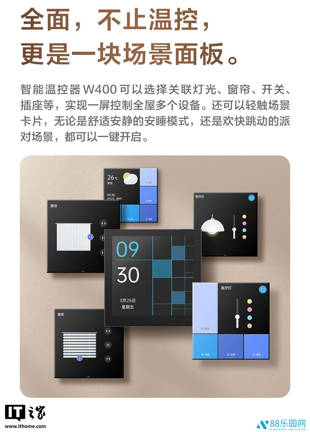 智能温控器 W400 采用标准 86 规格,可与智能开关自由组合。