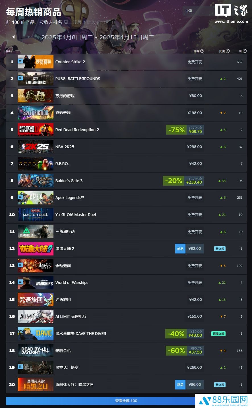 本站 4 月 15 日消息,Valve 刚刚公布了 Steam 最新一周游戏销量排行榜,第一人称模拟游戏《Schedule I》全球三连冠,在线合作恐怖游戏《R.E.P.O.》延续第二名,《荒野大镖客 2》冲进前三。