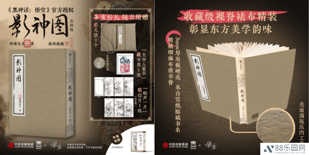 精装版《影神图》采用硬壳精装、书脊裱布及裸脊锁线工艺,可180°平摊阅读,性价比极高。随书附赠刺绣后天袋、藏书票及明信片,满足玩家的日常鉴赏需求。而收藏版则更为豪华,采用纯手工线装、传统筒子页及布面烫金屏风函套,售价268元。除包含精装版全部赠品外,还额外附赠《影神图·壁画》及“猴毛”线香。值得注意的是,收藏版限时销售,有意购买的读者需在5月20日前下单。