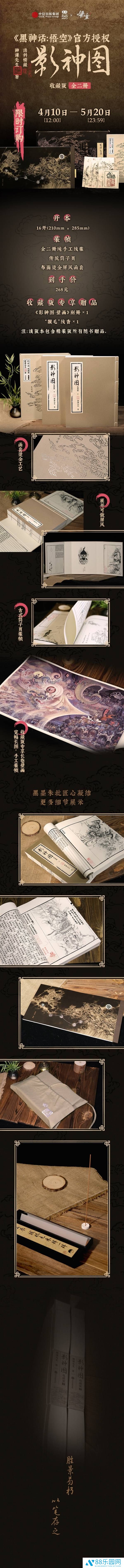 而《影神图:收藏版(全二册)》线装版则更为珍贵,采用全二册纯手工线装、传统筒子页以及布面烫金屏风函套,展现出极高的艺术品位和收藏价值。此版本限时订购时间为4月10日12点至5月20日23点59分,售价268元。除了包含精装版的所有赠品外,收藏版还额外赠送《影神图·壁画》别册和“猴毛”线香,让收藏者能够更深入地领略《影神图》的独特魅力。