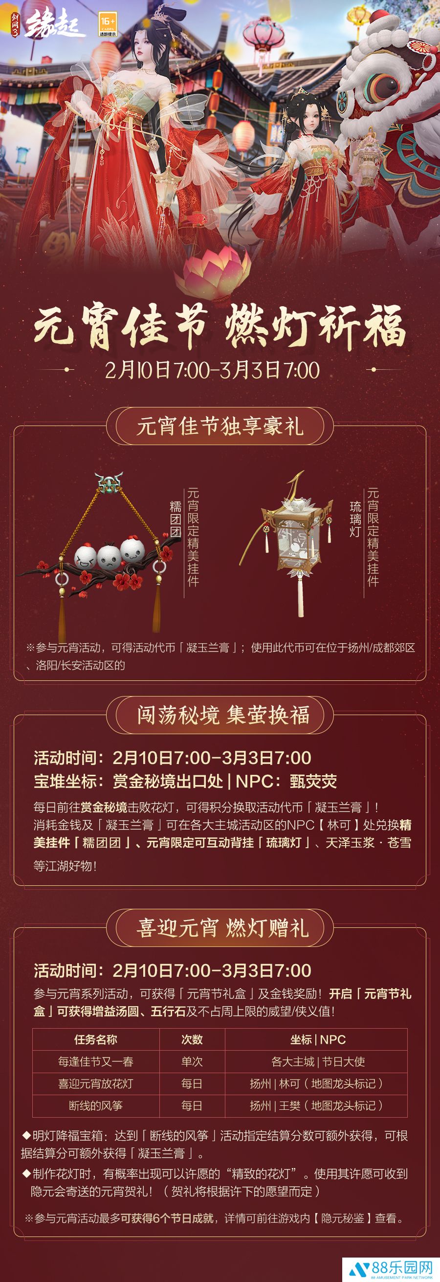 元宵佳节,花灯祈福。参与元宵节系列活动,完成秘境挑战、燃灯祈愿即可得活动代币「凝玉兰膏」,可兑换元宵节限定可互动背挂【琉璃灯】、萌趣挂件【糯团团】等多种好礼。