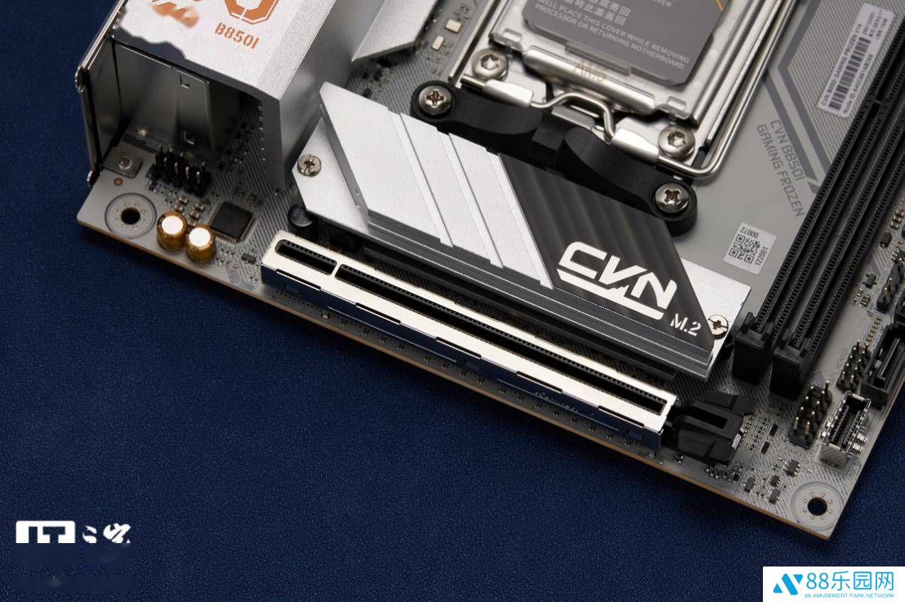 首先,从外观与设计来看,七彩虹CVN B850I GAMING FROZEN V14登陆舰主板延续了其军工主题的设计风格。外包装就透露出浓厚的工业风,打开包装后,主板本体更是以浅灰色PCB搭配黑色和银白色撞色金属装甲,加上标志性的橙色“85”数字,整体设计既硬朗又富有现代感,非常适合黑色或白色机箱。