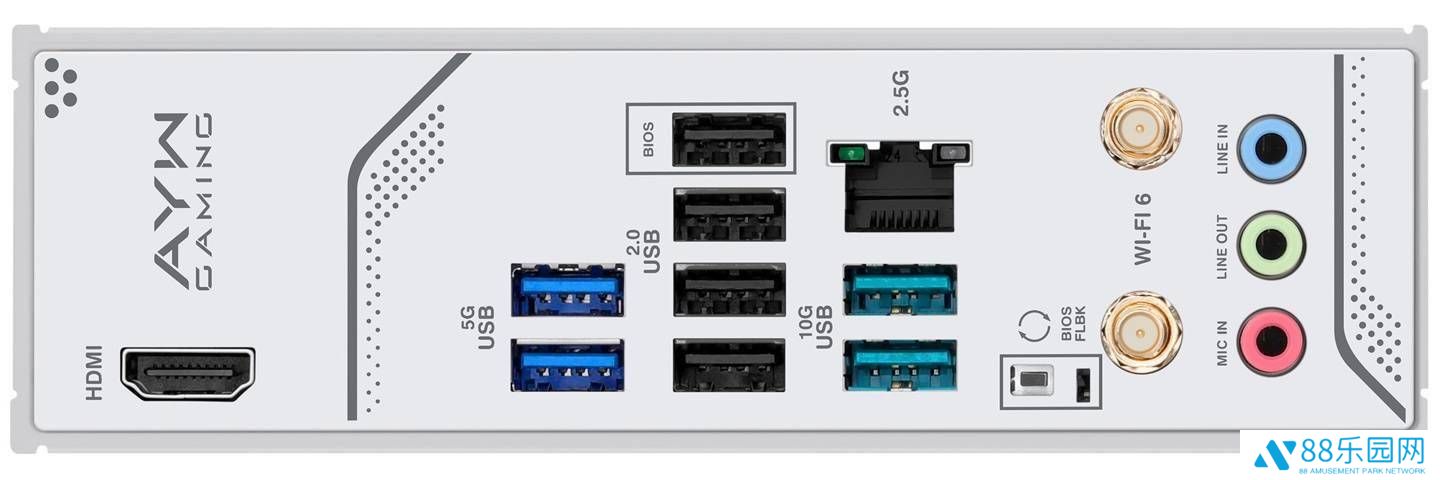 在外部I/O接口方面,主板提供了丰富的选项。板内接针包括1个USB-C 5Gbps接口(支持15W供电)、1个一分二USB-A 5Gbps接口和2个一分二USB-A 480Mbps接口。后置接口则包括1个HDMI 2.1 TMDS接口、2个USB-A 5Gbps接口、4个USB-A 480Mbps接口、2个USB-A 10Gbps接口、1个2.5GbE RJ45网络接口、一对Wi-Fi天线插孔以及3个音频插孔。主板还提供了BIOS FlashBack按键,方便用户进行BIOS更新。