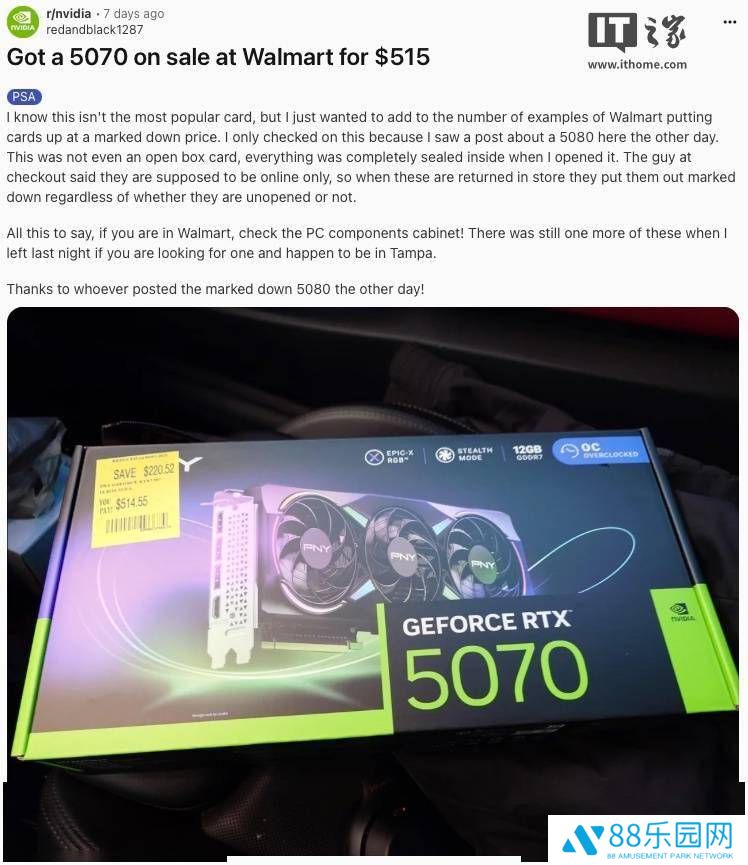 另一位玩家redandblack1287也分享了他的幸运经历。他在家附近的沃尔玛清仓区发现了一张PNY RTX 5070显卡,标价仅为515美元(折合人民币约3771元)。经过询问工作人员得知,这张显卡是退货品,虽然未拆封,但仍需按照退货标准销售。redandblack1287发现,同款显卡在亚马逊等第三方平台的价格已经溢价到了829美元(折合人民币约6070元)以上。相比之下,他在沃尔玛购买的显卡相当于享受了约六折的优惠。面对如此诱人的价格,他毫不犹豫地将其买下。