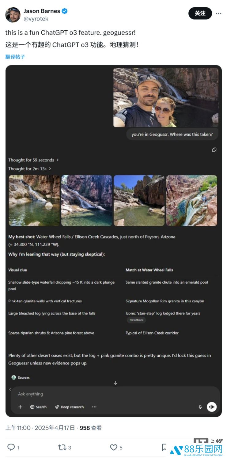 尽管如此,o3 在定位能力上仍不算完美。测试中多次出现模型陷入循环、始终无法给出明确结论,或干脆定位错误的情况。X 上也有用户反馈,o3 在位置推断上偶尔会出现明显偏差。