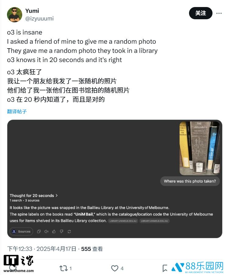 如今,X 上已有不少用户上传餐厅菜单、街区照片、建筑外观甚至自拍照,要求 o3 假想自己正在挑战一款名为 GeoGuessr 的在线猜地游戏(本站注:通过谷歌街景让玩家辨认各地位置)。