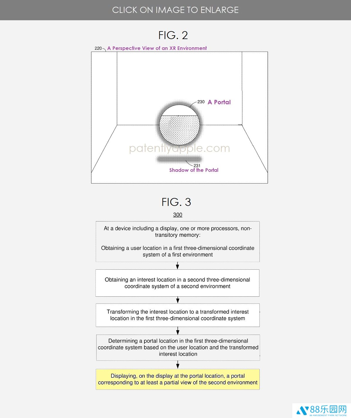除了重影补偿,苹果的另一项 HMD 专利聚焦于“动态门户”(Dynamic Portals)技术。该技术允许设备在不同三维环境中切换视角,通过获取用户在第一环境中的位置和第二环境中的兴趣点,计算并显示一个门户窗口,使用户能部分查看第二环境。