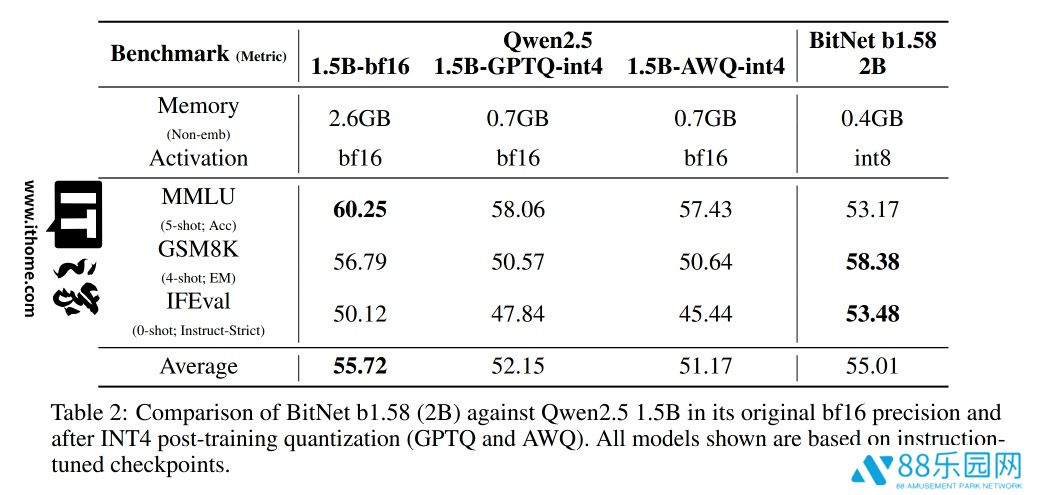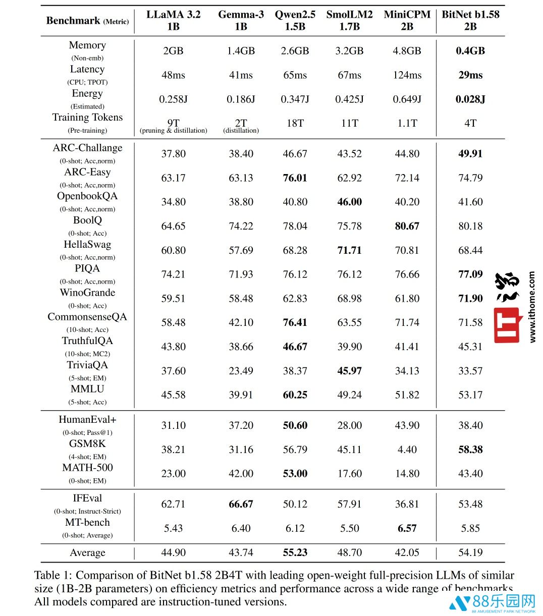 本站援引技术报告介绍,该模型性能直追同规模全精度模型,但计算资源需求大幅缩减。尤其令人瞩目的是,其非嵌入内存占用仅 0.4GB,远低于竞品 Gemma-3 1B 的 1.4GB 和 MiniCPM 2B 的 4.8GB。