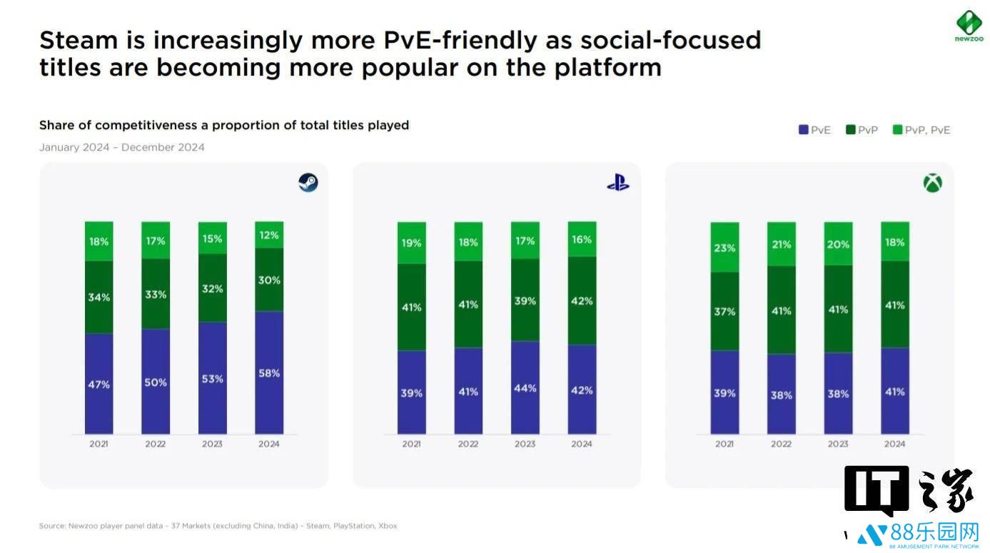 PvE,即玩家对战环境,指的是玩家在游戏中挑战由程序控制的NPC(非玩家角色)怪物、BOSS或完成各类副本任务,而非与其他玩家进行直接对抗。报告数据显示,去年Steam平台上58%的玩家喜爱的游戏都属于PvE类型。相比之下,Xbox和PlayStation两大主机平台上,非竞技性游戏的占比分别为41%和42%。