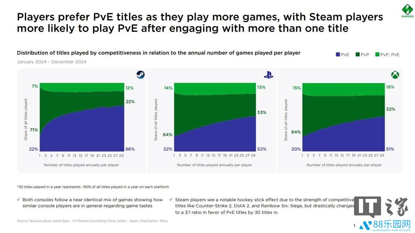 此次调查基于超过100万名玩家的原始遥测数据,全面衡量了不同游戏平台上的玩家兴趣。Newzoo的研究还进一步发现,Steam玩家在体验过多款其他类型游戏后,更倾向于选择PvE游戏作为他们的游戏首选。