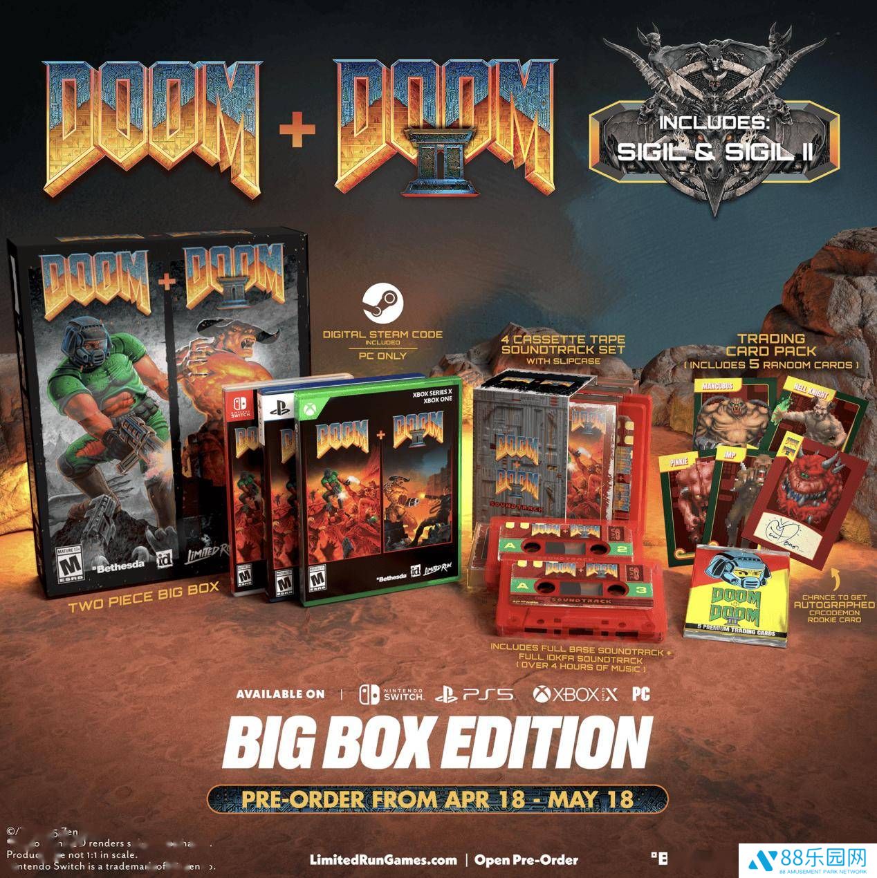 在Big Box豪华版中,除了游戏本体之外,玩家还将获得原声碟磁带和游戏实体纪念卡片等珍贵收藏品。而Will It Run限定版则更加豪华,其包装盒内置屏幕可直接游玩原版《毁灭战士》游戏,同时还包含游戏收藏证书、怪物Cacodemon手办、以Cacodemon为造型的游戏机(同样可玩原版《毁灭战士》)、原声碟磁带以及游戏实体纪念卡片,每一项都是对《毁灭战士》系列的致敬和纪念。