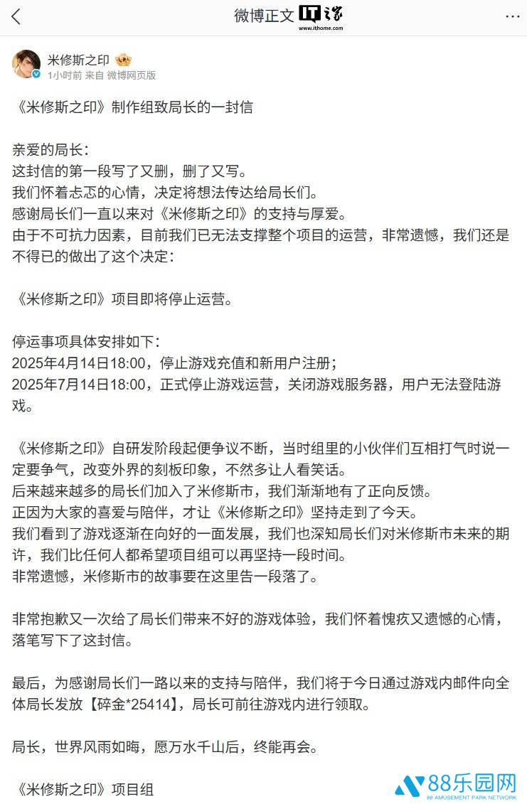 然而,尽管游戏在不断发展中展现出向好的趋势,项目组也深知玩家们对米修斯市未来的期待,但遗憾的是,他们最终还是无法继续坚持下去。在官方通知中,项目组表达了深深的愧疚与遗憾,并向一直以来支持他们的玩家们致以最诚挚的歉意。