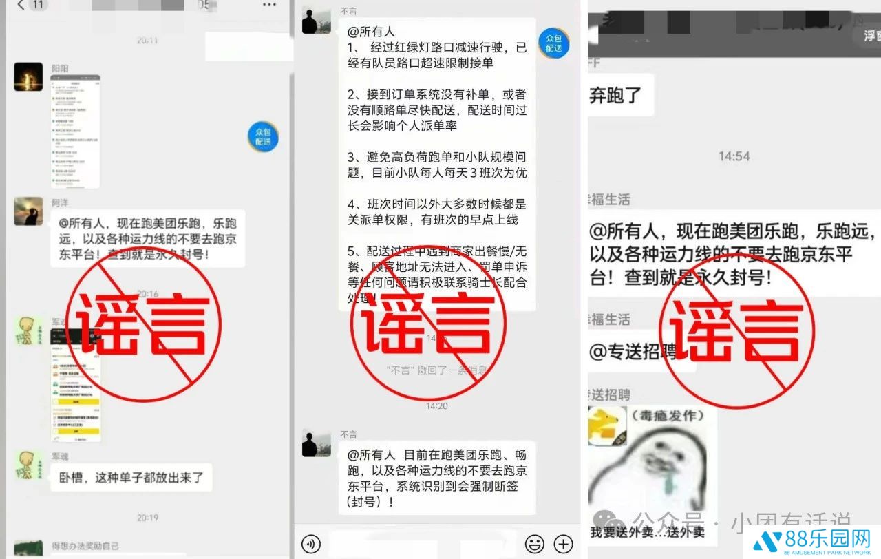 曹某自述是从其他群里看到“乐跑、乐跑远骑手私自跑某平台,美团会永久封号处理”的谣言,觉得好玩,就在乐跑骑手群内转发。按照《网约配送员协议》及骑手 App 中的秩序保障规则,编造、散播虚假信息或误导性信息,影响公共秩序,均属违规行为,平台已与其沟通澄清,并依照协议进行处理。