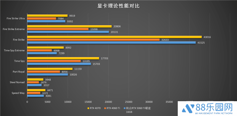 在理论性能测试中,RTX 5060 Ti曜夜16GB显卡的表现位于RTX 4060 Ti和RTX 4070之间,相比上一代RTX 4060 Ti有约25%的性能提升,但仍未达到RTX 4070的水平。其最大的亮点在于支持最新的DLSS 4技术,这一技术通过AI生成帧,极大提高了游戏画面的流畅度。